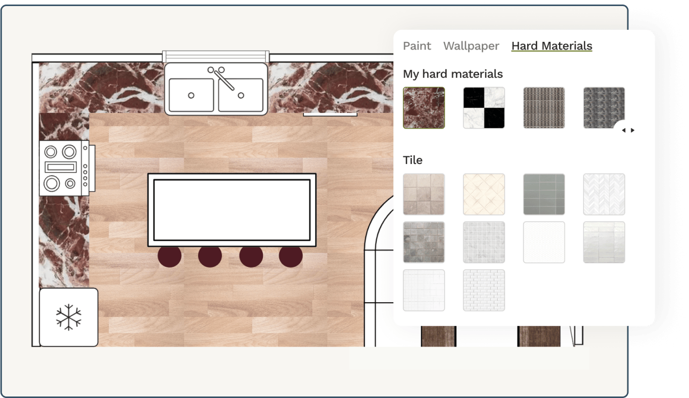 If it can be clicked, it can be customized. Visualize your floor plans and elevations in a variety of finishes and materials with our plan fill tools. Create flooring transitions with a custom shape, fill in tiled and hard surfaces, then add wallpaper – all in just a few clicks.