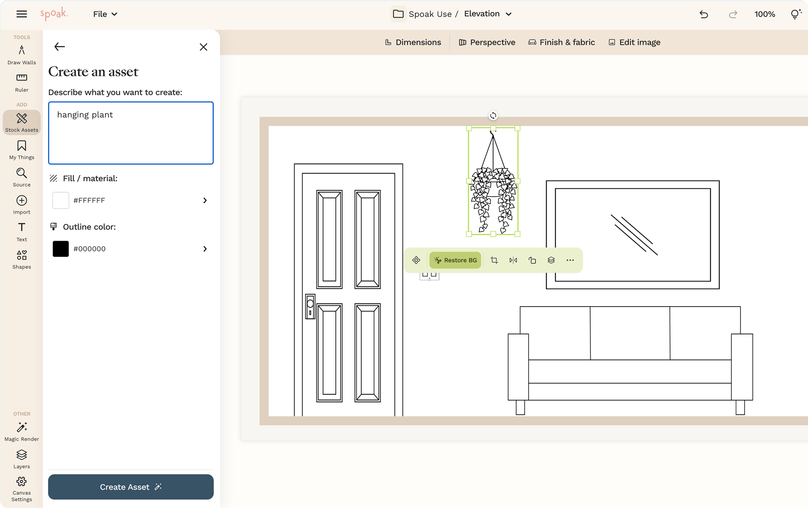 Magic Asset for floor plans and elevations closes that gap. Instead of requesting new assets and waiting for them to be created, you can now generate custom, to-scale floor plan and elevation assets in seconds—right inside Spoak, using the same simple tools you already know.