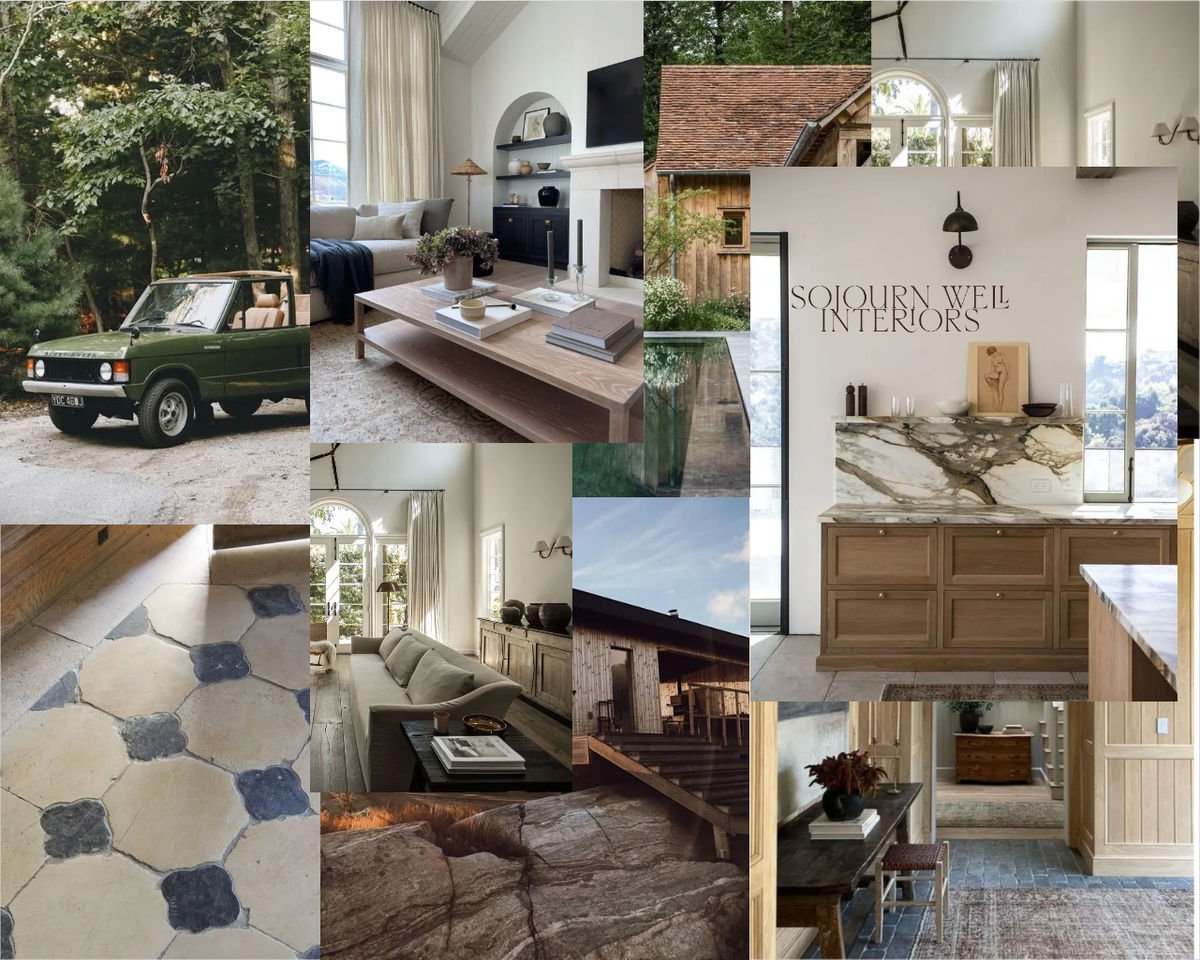 Looking at this mood board by designer Ashley Harrison transports us to a luxe weekend cabin escape that includes plenty of lush green views and, in this case, all the well-designed details of our dreams. Veined marble, vintage tile, and stunning wood cabinetry details take the minimal color palette to a new level.
